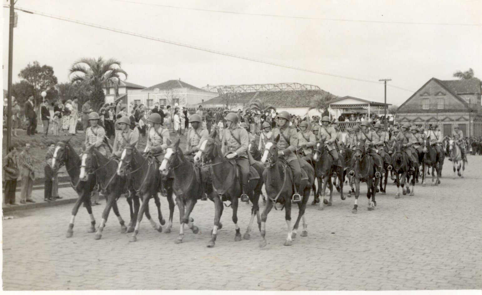 Histórico: Dezenas de soldados montado a cavalo desfilam em frente à praça na rua Quinze de Novembro, observados por muitas pessoas e tendo ao fundo edifícios antigos da cidade.